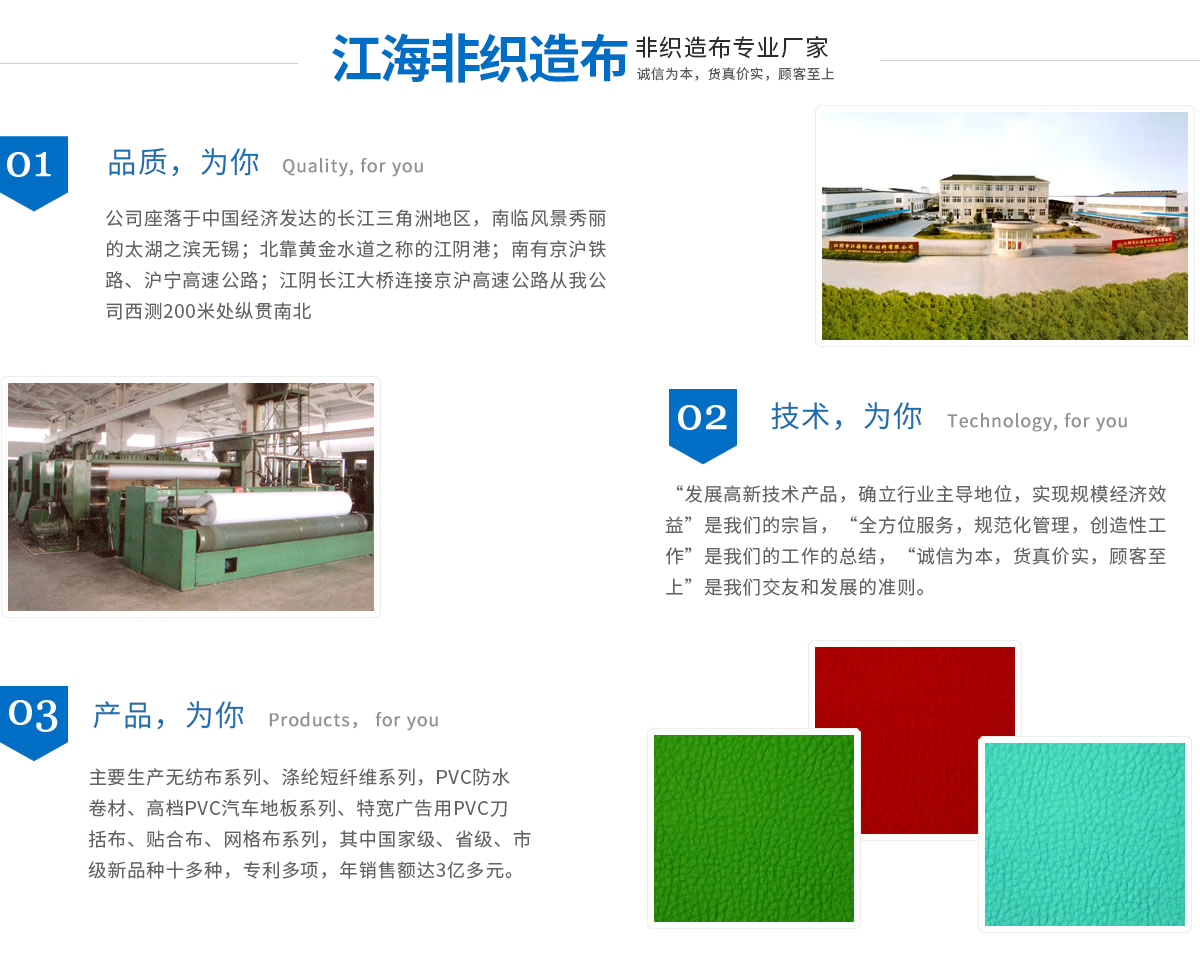 江海企業有江陰市江海非織造有限公司、江陰市江海防水材料有限公司、江陰市三江寬幅無紡布有限公司、江陰市三江織物涂層新材料有限公司組成,均屬于江蘇省民營科技企業。企業現擁有員工近千名,占地15萬平方米,廠房建筑面積達80000多平方米,凈資產超億元,主要生產無紡布系列、滌綸短纖維系列、PVC防水卷材、高檔PVC汽車地板系列、特寬廣告用PVC刀括布、貼合布、網格布系列,其中國家級、省級、市級新產品十多種,專利多項,年銷售額達3億多元。